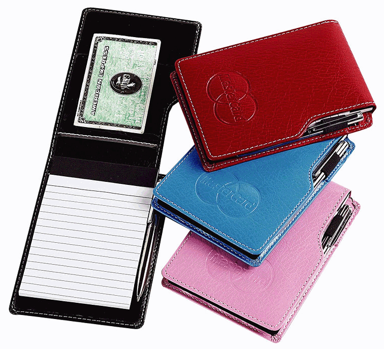 - Bonded leather notepad pocket jotters with contrast stitching.
